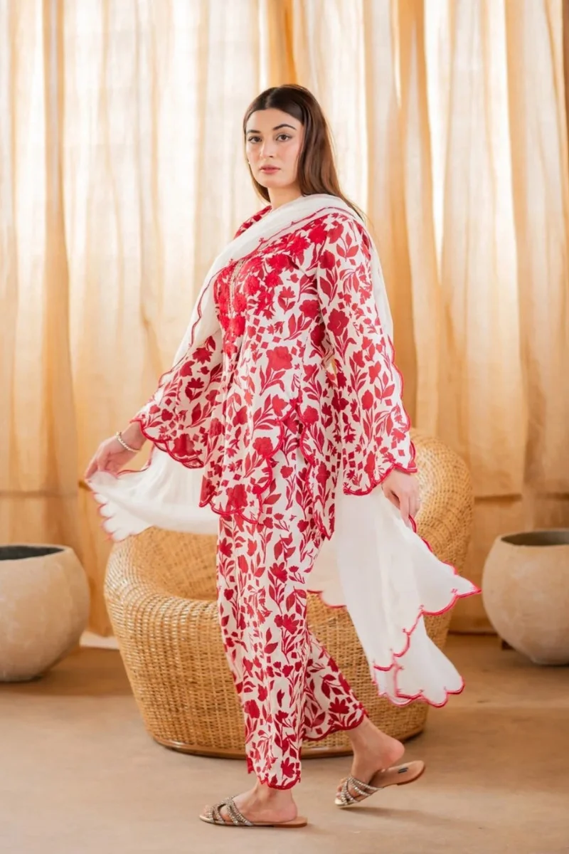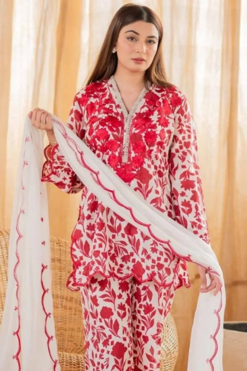 Digital Printed Lawn Shirt with Neckline Embroidered Patch Digital Printed Lawn trouser Embroidered Bamber Chiffon Duppata